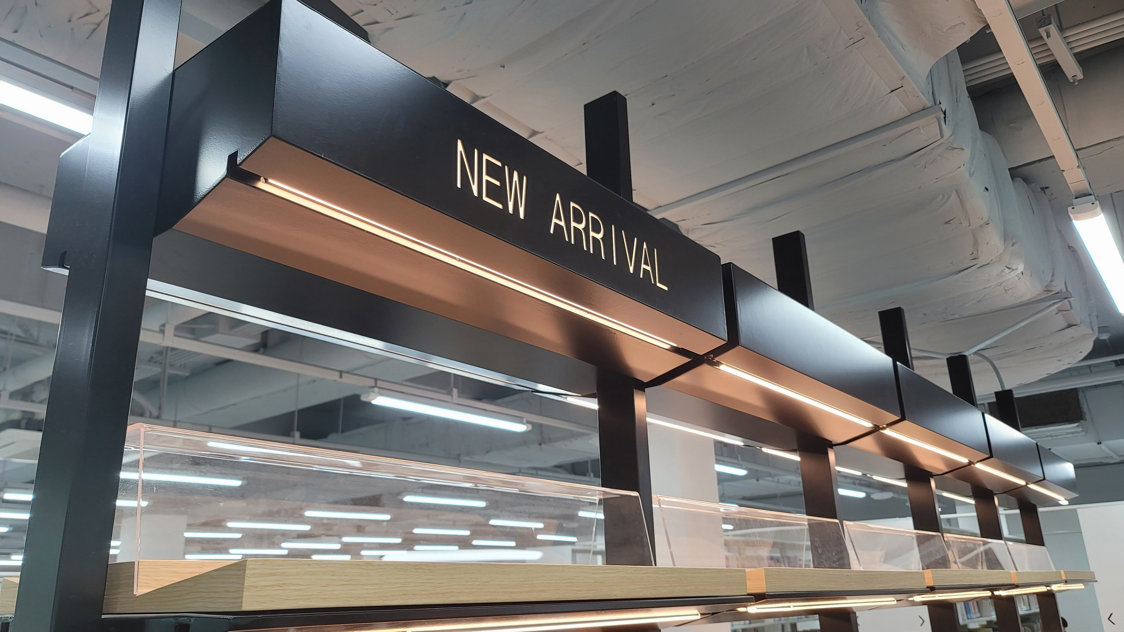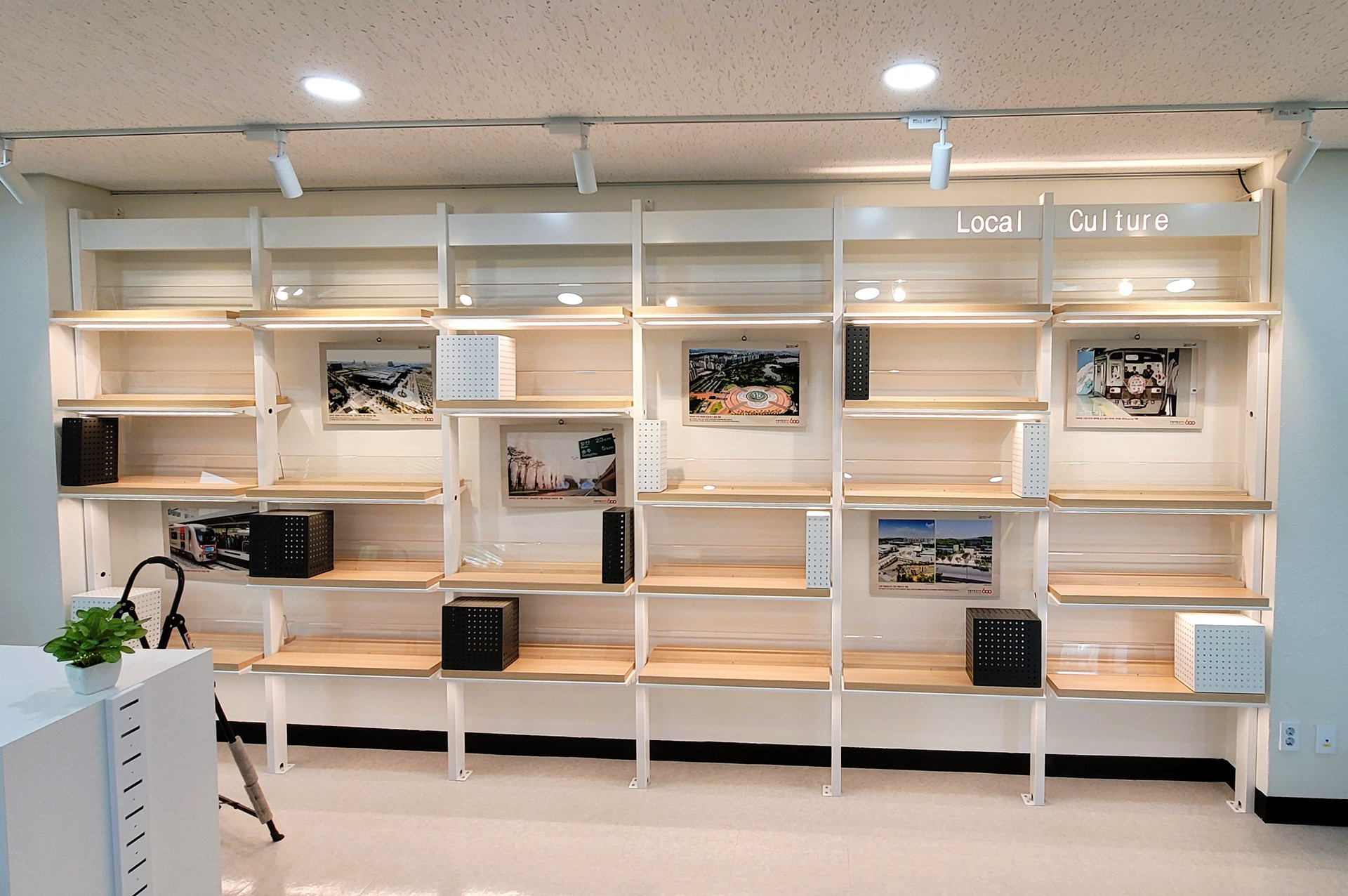 - 무늬목 상판, 아크릴 전시대, 간접조명 매입